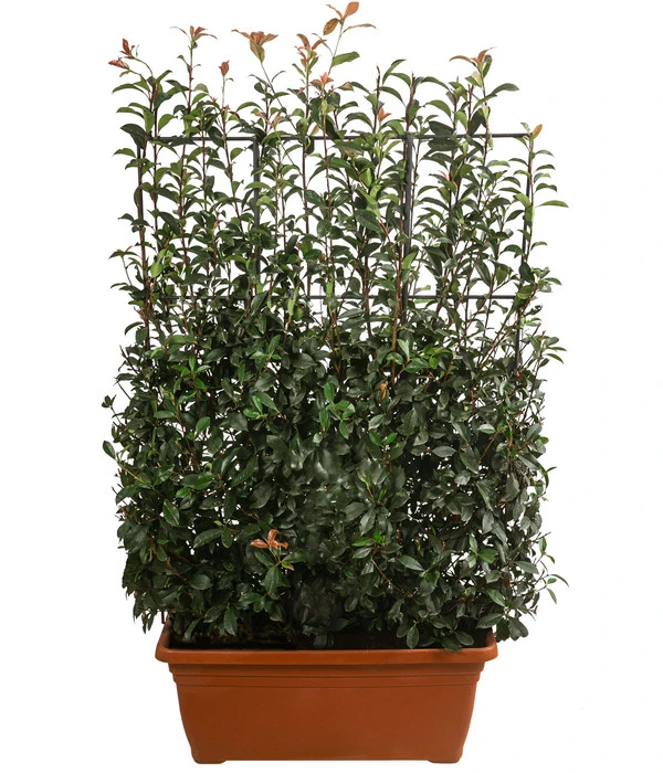 Wie Sie sicherlich bereits gesehen haben, bieten wir Ihnen die Purpur-Glanzmispel ‚Glanzkopf‘ in einem rechteckigen Kübel mit einem Fassungsvermögen von 35 l an. Und weil die Pflanze in der Baumschule bereits an das Wachsen an einem Spalier gewöhnt wurde, haben Sie einen fertigen Sichtschutz, der aus Ihrer Terrasse oder dem Balkon schnell eine blickdichte, private Oase macht.